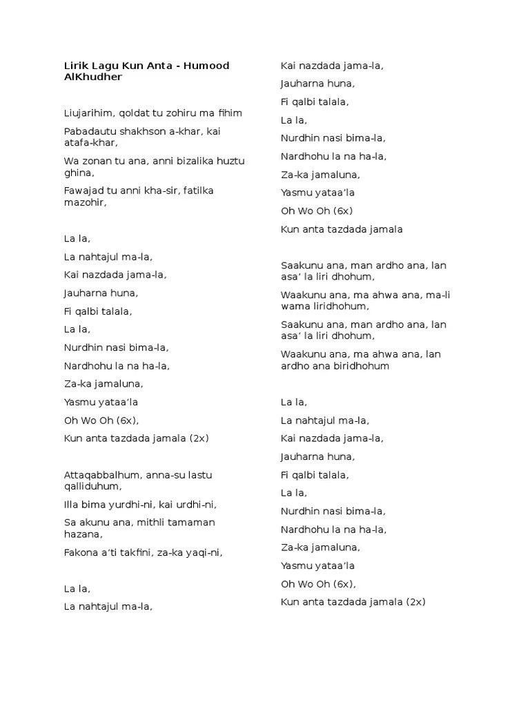 Lirik lagu kun anta / كُنْ أَنْتَ dan artinya by ahmad ghani posted on november 11, 2020 lirik lagu kun anta & Sejak mengeluarkan kun anta, dirinya juga tak bermimpi akan mengeluarkan lagu kun anta di luar bahasa arab. Berikut chord kunci gitar kun anta humood alkhudher: Download daftar kumpulan hq audio mp3 dari download video klip kun anta versi indonesia dengan mudah dan gratis!. Liujarihim, qoldat tu zohiru ma fihim.